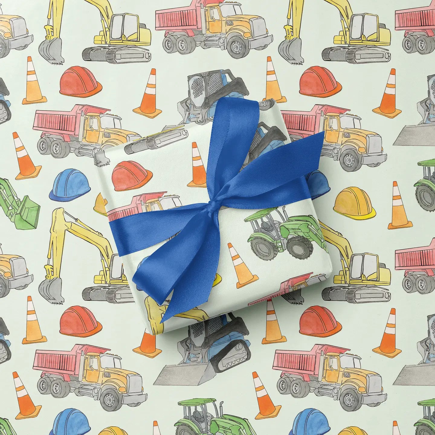 The ultimate gift wrap for little construction fans. Featuring an excavator, skid steer, tractor, and dump truck on a light green background, this design is packed with watercolor-painted construction vehicles ready to dig into the celebration. Bright, fun, and full of energy, it’s perfect for kids and toddlers who love all things trucks and construction. A great fit for gift shops, stationery boutiques, and birthday assortments for kids. PRODUCT DETAILS • Set includes 3 rolled sheets • Each sheet measures 20" x 29" • Printed in the USA on thick, opaque paper • Packaged in clear poly (no cardboard core for reduced waste) • Designed by Gert & Co, a woman-owned company based in Maine, USA • SKU: GERTGW00048-R