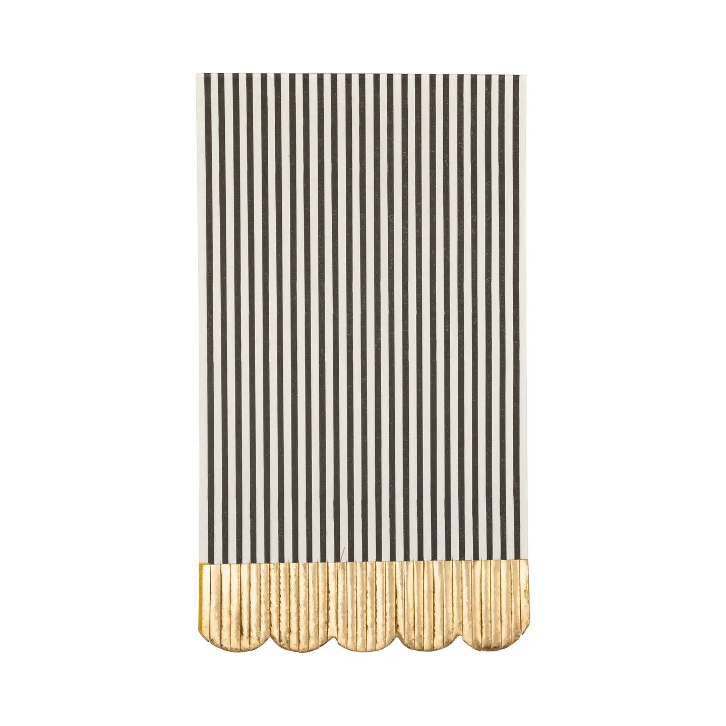 Spice up your grad party with our dinner napkin! Adorned with black and cream stripes and a playful fringe, this napkin is both functional and stylish. Perfect for adding a touch of elegance to your table setting. • 18 paper napkins with fringe • napkins are 4 ¼" × 7 ¾" • gold foil